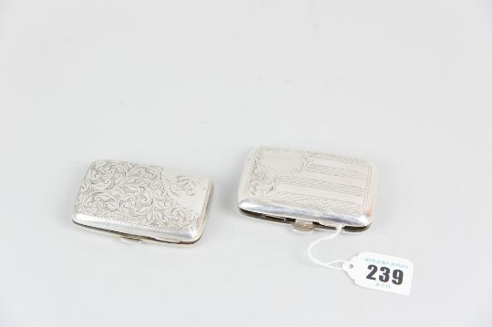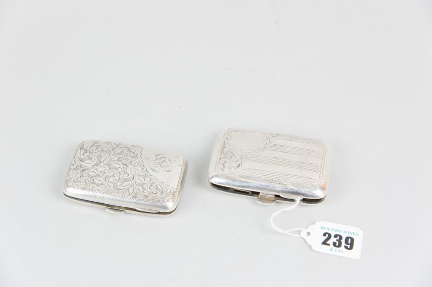 A ladies small bright cut cigarette case with scrolled decoration, 1.7ozs, Birmingham 1900 and another similar, 1.4ozs, Birmingham 1910