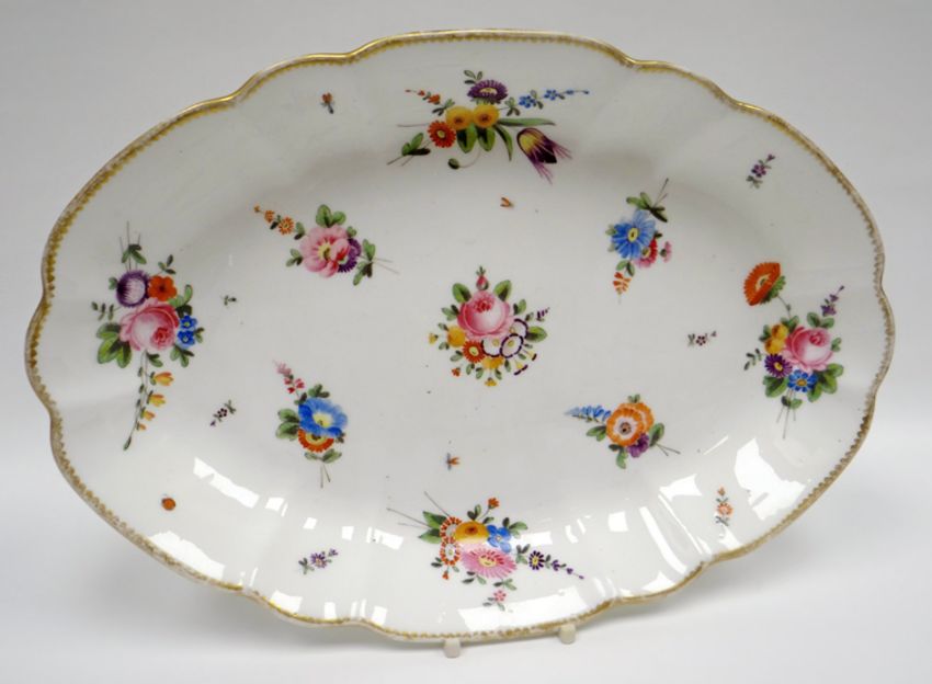 NANTGARW porcelain - oval dish of alternate lobed form, with sharp incline downwards from the edging to an extensive centre, London decorated with nine bouquets of colourful flowers, pendants of smaller flowers and with four insects, impressed mark NANT GARW CW, 11.25ins long (29cms)