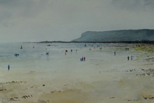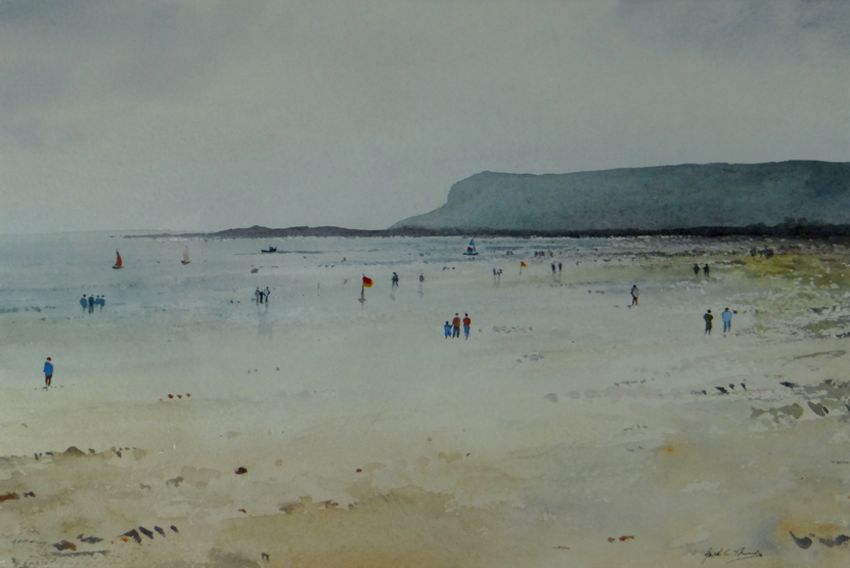 GARETH THOMAS watercolour - figures walking on beach with boats on water, and headland in background, signed, 10.5 x 15 ins (26 x 38 cms)