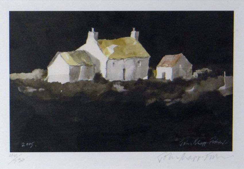 JOHN KNAPP FISHER print - limited edition print (441/850) of white washed farm and outbuildings, signed and dated 2005, 5 x 8 ins (13 x 20 cms)
