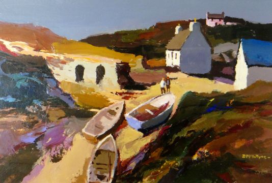 DONALD MCINTYRE acrylic - harbour with cottages, two figures and beached boats, entitled verso 'Porthgwarra 969', signed, 21 x 31ins (54 x 79cms)