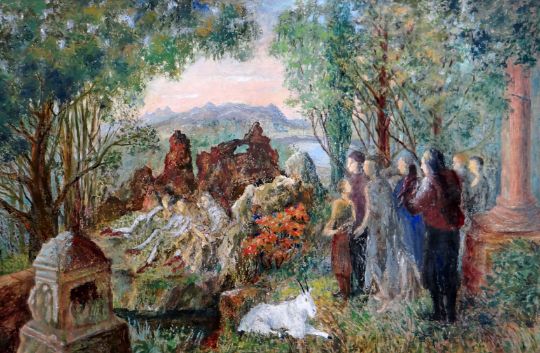 FELICITY CHARLTON oil on board - group of onlookers observing ethereal scene of three reclining figures, entitled and signed verso 'Encompass' 1998, 24 x 36 ins (60 x 91 cms)