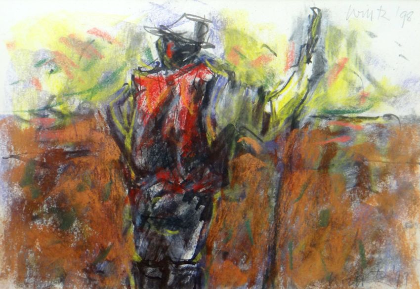WILL ROBERTS mixed media - standing figure in red waistcoat, entitled verso 'Farmer', signed and dated 1998, 9 x 13ins (23 x 33cms)