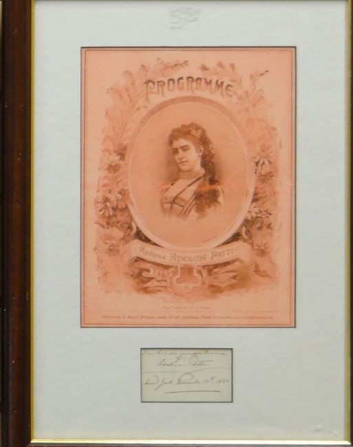 IVOR NOVELLO autograph and silver hairbrush - hand-signed postcard jointly framed with a monogrammed silver backed hairbrush from his ownership, frame size 15 x 16.5ins (38 x 42cms); together with ADELINA PATTI autograph - handwritten signature,'New York, November 15th 1881' framed with facsmile, frame size 19 x 14ins (48 x 36cms)