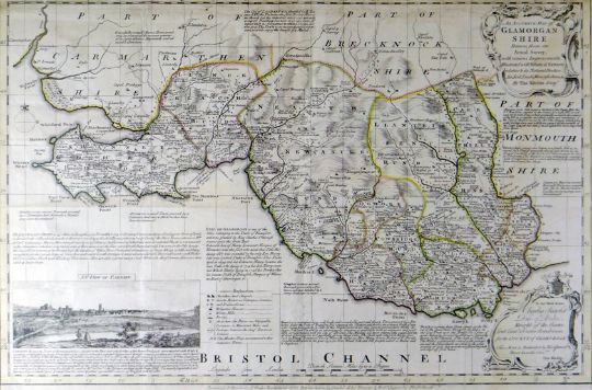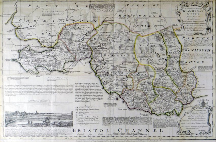 THOMAS KITCHIN coloured and tinted map of Glamorganshire with an inset view of Cardiff, drawn for Charles Pawlet, Duke of Bolton, 14 x 21 ins (36 x 53 cms)