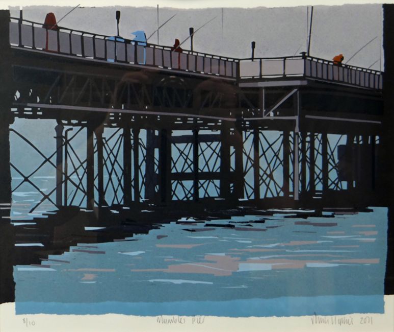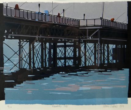 SARAH HOPKINS print - limited edition (8/10) silkscreen print of fishermen on Mumbles Pier, signed and dated 2011, 13 x 15.5 ins (33 x 39 cms)