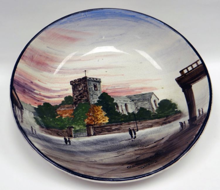 LLANELLY POTTERY - an exceptionally rare large shallow bowl, painted by Shufflebotham and showing the 'Old Parish Church, Llanelly' with painted title, no marks to base, 12ins diam (31cms) circa 1908-1916 Note: as outlined on Page. 42 of 'Llanelly Pottery' by Dilys Jenkins (1968, DEB Books, Swanea), the 'Old Parish Church' bowls were said to have been ordered by Lady Howard Stepney as twelve Christmas gifts. There is an example of the bowl at the museum in Parc Howard
