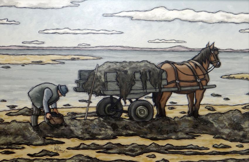 ALAN (EA) WILLIAMS acrylic on canvas - horse drawing cart on the estuary with male figure gathering seaweed entitled verso 'Seaweed Gatherer', signed, 19.5 x 29.5 ins (50 x 75 cms)