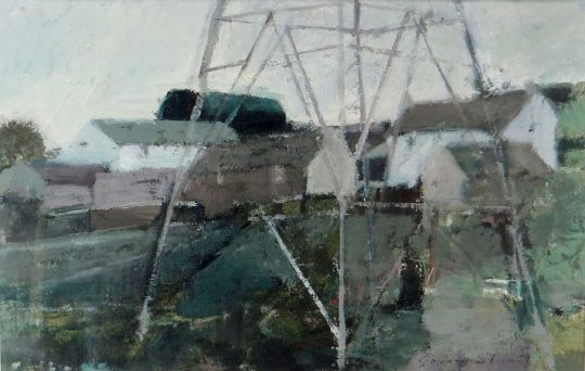 GORDON STUART oil on paper - farm and outbuildings viewed through the frame of an electricity pylon, entitled verso 'Welsh Farm', signed, 8.5 x 13 ins (21 x 33 cms)