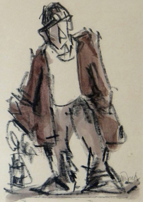 MIKE JONES mixed media - standing miner, entitled verso 'Collier', signed, 11.25 x 8ins (29 x 20cms)