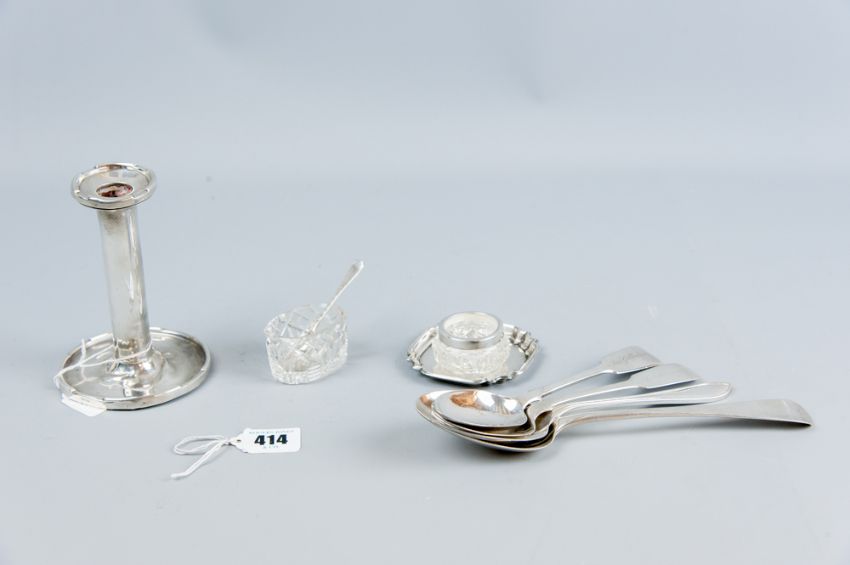 Two silver fiddle patterned dessert spoons and two serving spoons, mixed dates, total 7 ozs, a small square silver dish, a silver rimmed salt pot and a circular based capstan column silver candleholder (damaged, scrap), (a parcel)