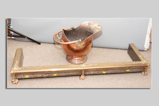 A copper helmet coal scuttle with swing handle, a brass and copper oblong fender on claw supports and a fireguard