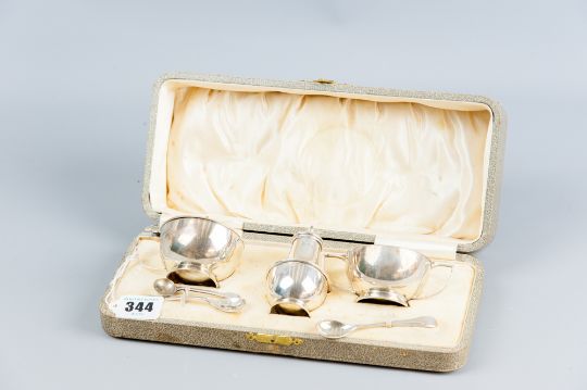 A cased three piece silver condiment set with spoons and the mustard pot with Bristol blue liner, 4 ozs, Birmingham 1938