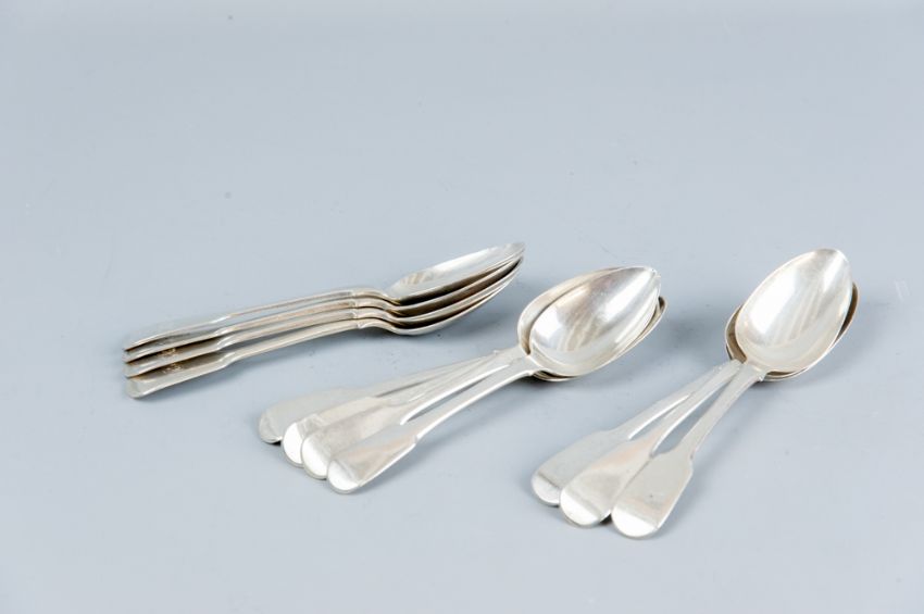 A mixed parcel of eleven silver serving spoons, majority George IV, 16 ozs