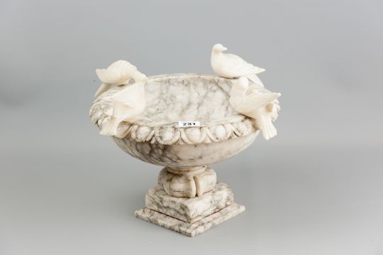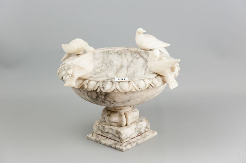 An Italian veined alabaster bird bath with carved egg and dart rim surmounted with four doves on a stepped pedestal base, 20 cms high, 29 cms diam (repairs and slight losses)