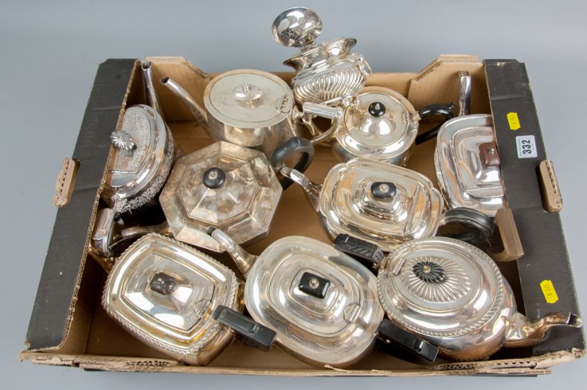 A parcel of approximately ten electroplated teapots
