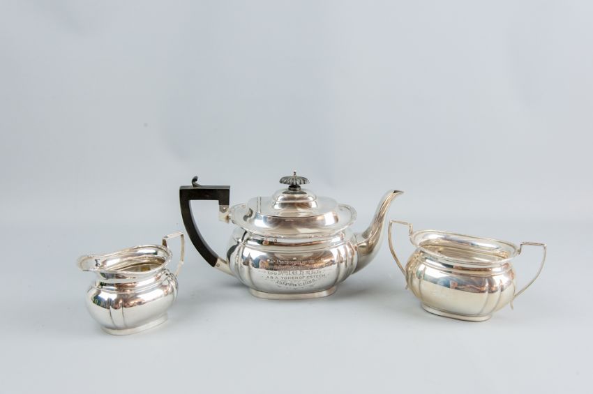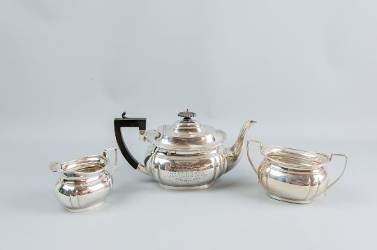 A three piece silver tea service, each piece of oval plain form, the inscribed teapot having a black composition lid and knop, 34 ozs gross, Birmingham 1913
