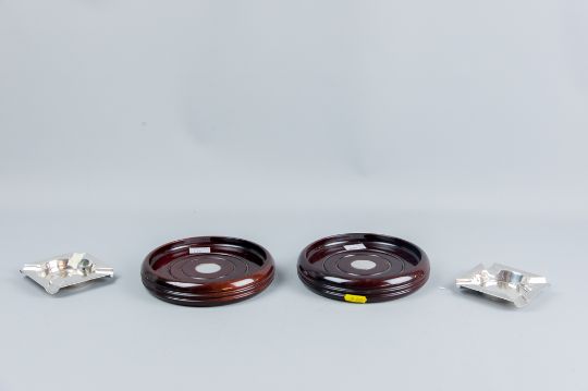 Two square silver ashtrays, one with engine turned border and each being a sporting presentation and inscribed 'Laurie Cup', the winner in each case 'C V Heptonstall, 4.6 ozs, Sheffield 1955 and 1957 and a pair of circular lignum large coasters, 6.5 ins (16 cms) diameter with circular silver centre inserts