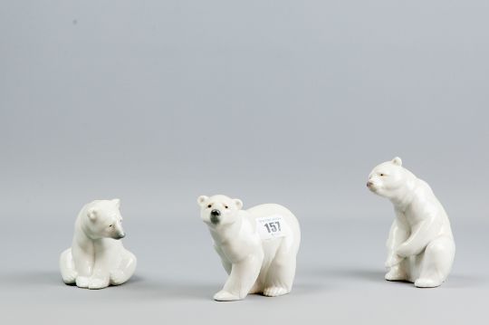 A Lladro group of three individual polar bear cubs in different poses