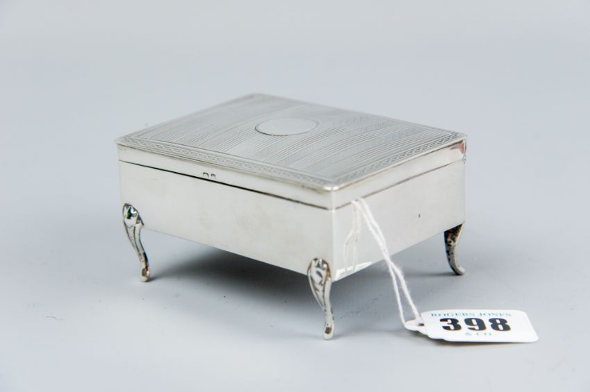 A small plain silver slightly oblong ring box with engine turned lid and on four corner supports, 5.3 ozs gross, Birmingham 1919