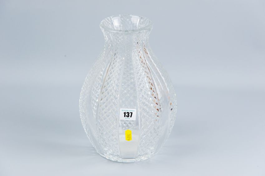 An heavy cut glass baluster vase of panelled form, each narrow panel alternating between plain and hobnail cut, 28 cms high