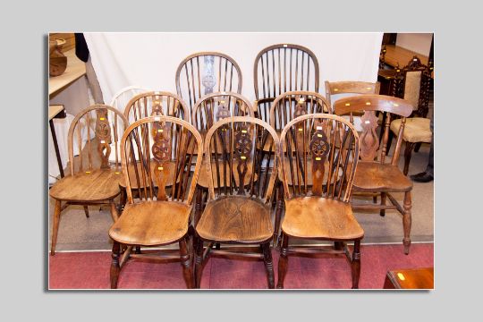 A set of four (three plus one carver) elm Windsor chairs with spindle and Celtic cross backs, a further elm spindlebacked elbow chair, three Windsor wheel and spindlebacked chairs, two Windsor spindle chairs (one painted) with Prince of Wales feathers and two Windsor farm type chairs (a parcel, twelve in total)