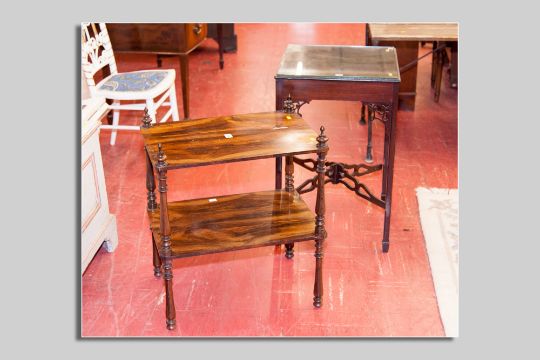 A two tier oblong topped rosewood whatnot, 56 x 39 cms and a square topped mahogany occasional table with fretwork corners and cross stretchers (damage)