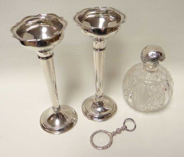 A pair of English silver rose-vases on circular bases, marks unclear; together with hobnail cut-glass scent bottle with silver lid and a Sterling silver framed magnifying glass