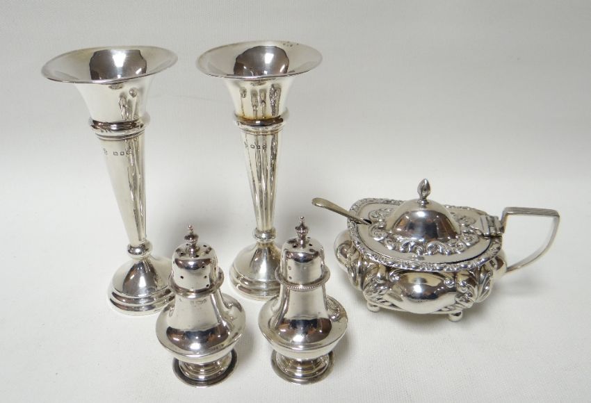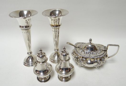 A silver mustard pot, a pair of silver rose-vases and a pair of silver pepperettes