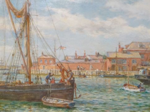 BERNARD GRIBBLE oil on board - busy British harbour, figures and buildings, signed, 11.5 x 15.25ins (29 x 39cms)