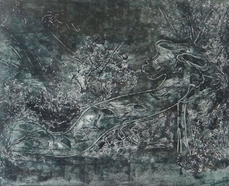 CYNTHIA MORRIS collagraph artist's proof (1/97) entitled 'Cosmeston Monster III', signed, 15 x 17.5ins (38 x 45cms)