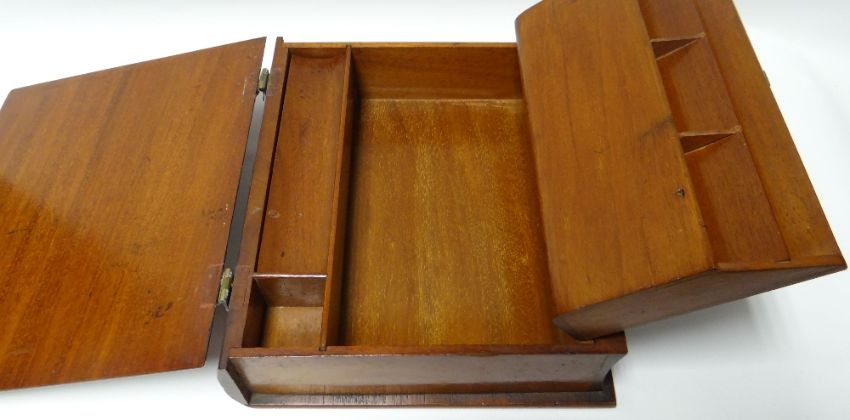 A nineteenth century mahogany writing box with brass cartouche and hinges, 10ins wide (25cms)
