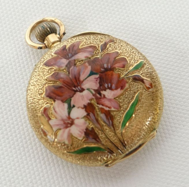 A 12ct gold ladies keyless fob watch with white enamel fancy dial and with botanical study in enamel to the case