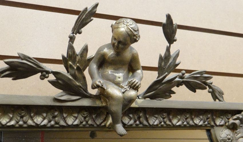 A carved gilt-wood framed wall-mirror with cherubic and laurel finial, 107cms high, circa 1880s