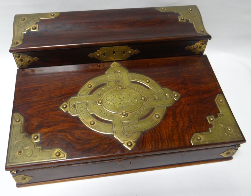 An nineteenth century naval writing and stationery slope with brass mounting and inscribed Capt Waterman, Nurnberg, October 13, 1867, 15ins wide (38cms)