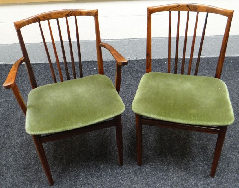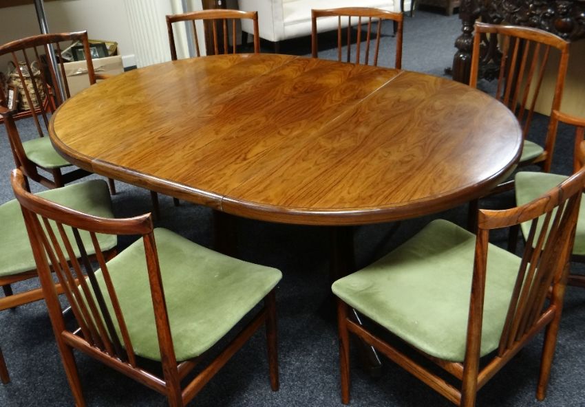 A Danish rosewood circular dining table on centre four-spoked pedestal, 119cms, extending with two extra leaves to 220cms, and with eight matching chairs, two being carvers, circa 1970s