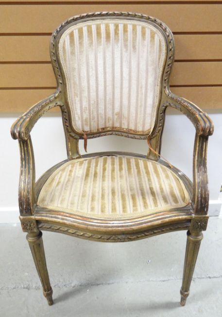 An inlaid mahogany Sheraton-style settee, with floral tapestry seat, circa 1910, 43ins wide (109cms) together with a carved gilt wood open armchair