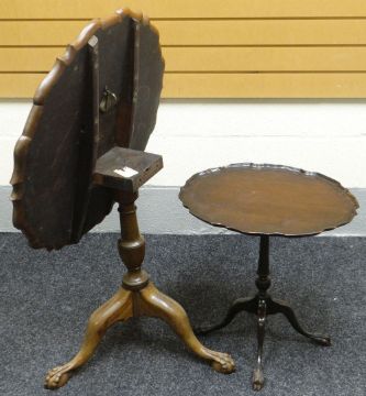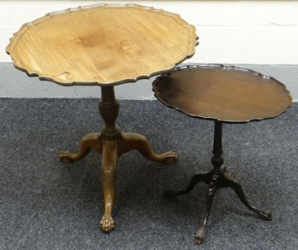 A faded-mahogany tilt-top galleried table with scrolling bordered top upon tripod supports with claw-feet, 75cms diam; together with smaller similar without fading, 54cms