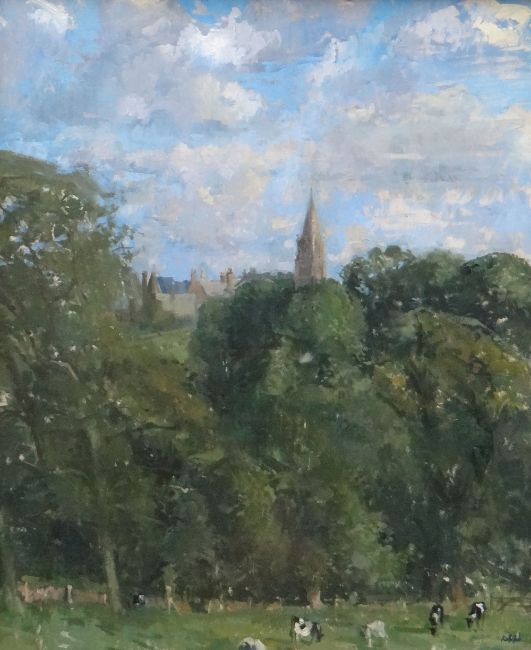 PETER KUHFELD acrylic on board (?) - cows grazing before tree-line with village beyond, entitled verso 'Antony Village and Church, from the Meadows, Antony House, Cornwall', signed, 18.25 x 14.5ins (47 x 37cms)