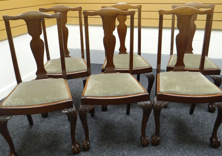 A set of six mahogany dining chairs with shaped splat backs, carved ball and claw feet and drop-in seats