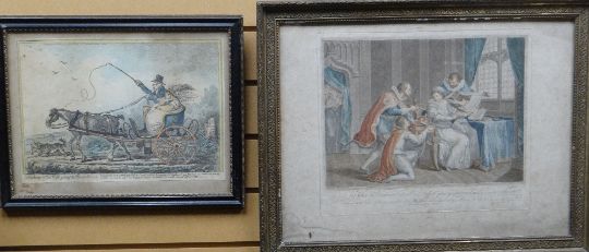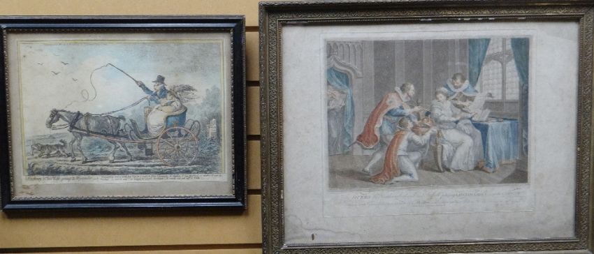 AFTER BARTOLOZZI coloured engraving print - entitled 'The Dukes of Northumberland and Suffolk praying Lady Jane Gray to accept the Crown', 16 x 21ins (41 x 53cms); together with another antique print 'A Cockney and his Wife…..'
