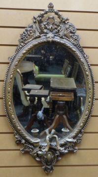 An oval gilt wood framed mirror with candle sconces and being decoratively carved in the Rococo style, 37ins high (94cms)