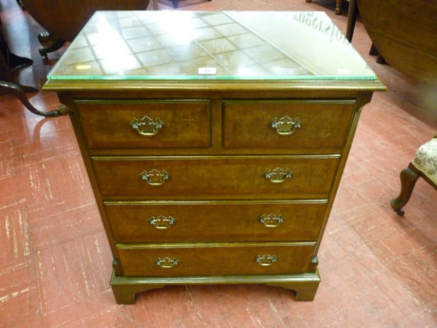 A reproduction walnut chest of two short over three long drawers, all with Georgian style brass backplates and swing handles, reeded canted corners on bracket feet, 77 x 62 cms