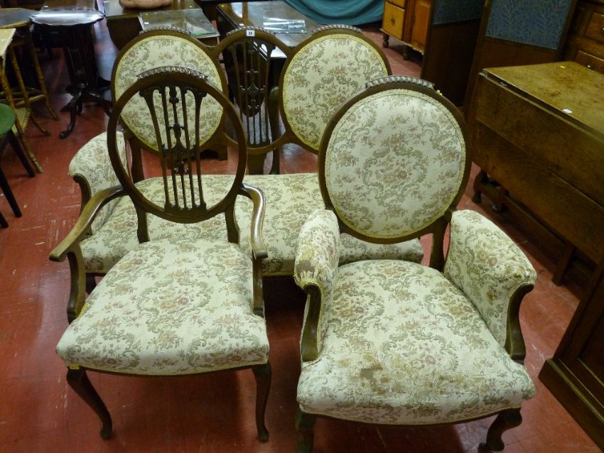 An early 20th Century drawing room suite of two seater couch and two elbow chairs, all with shield backs, one chair with an upholstered back
