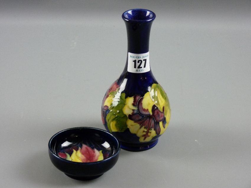 A Moorcroft pottery blue ground 'Freesia' bottle vase, 16 cms high and a small footed dish, 7.5 cms diam
