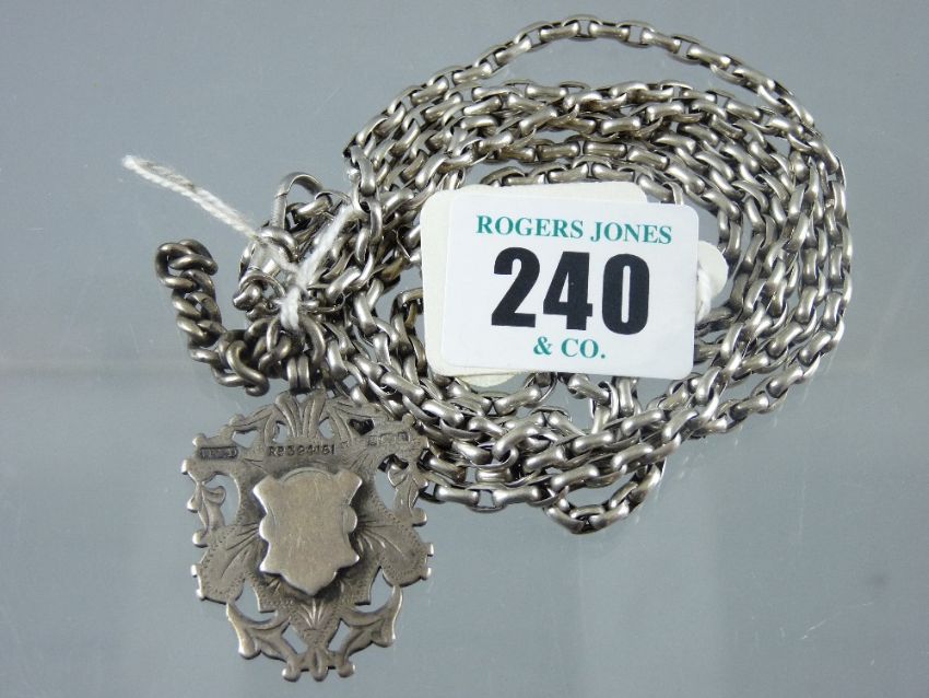 A silver link neck chain, 70 cms with swivel and silver trophy pendant, total 53 grms (1.7 ozs)