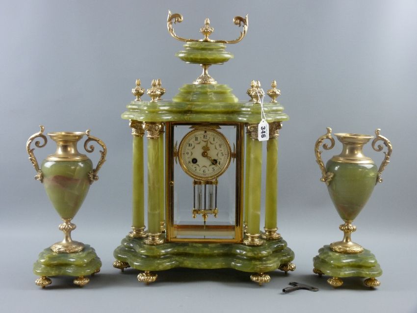 A French onyx and gilt metal clock garniture set with good shaped base, six pillared temple style clock case with urn finial, painted dial with twin wind mercury pendulum driven movement striking on a bell, stamped to the reverse 'Special VMB', 51 x 34 cms the clock