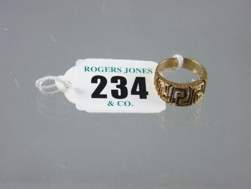 An unmarked gold dress ring in Grecian Key style, 3.6 grms, 'G/H' fitting