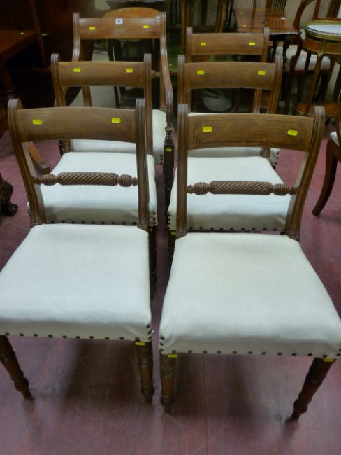 A set of six (five plus one) Regency mahogany dining chairs with broad line inlaid top rail, curved spiral central rail with turned tapering front supports and sabre back supports, leatherette stuff-over seats with metal studding