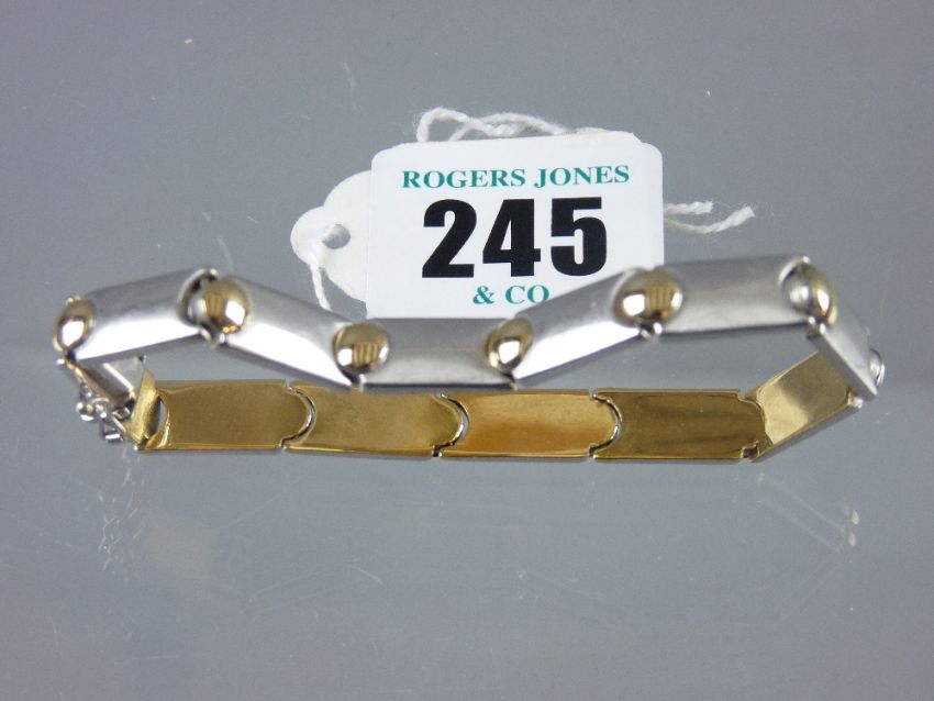 A white metal (marked fourteen carat) satin effect bracelet with yellow metal ball decoration, 13.8 grms